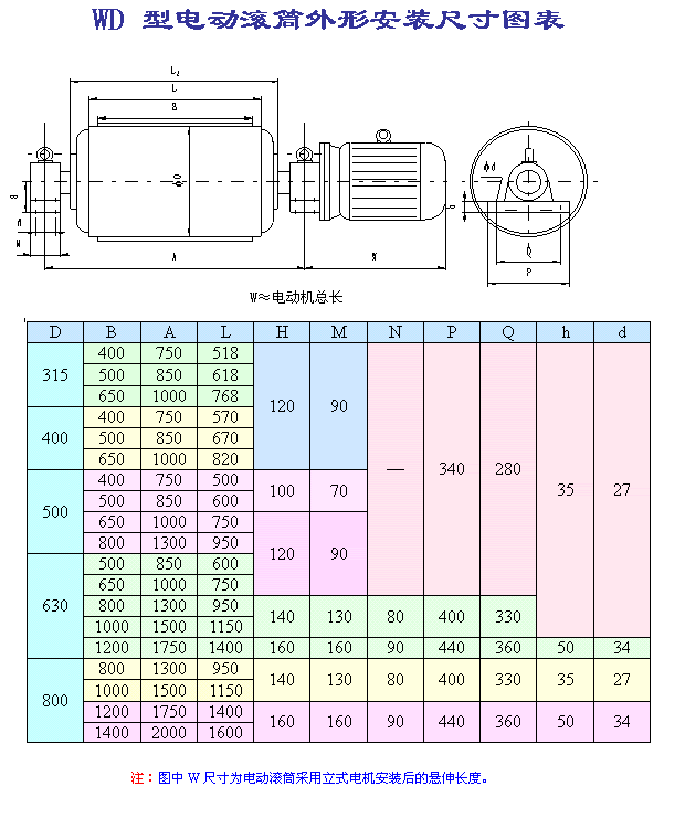 (1).因目前外裝式電動滾筒尚未制定相關行業標準,本廠將該型號電動滾筒首位代號用W(“外裝”的首位漢語拼音)表示。外裝式電動滾筒外置電機可分為立式電機和臥式電機,用戶訂購時請加以說明;