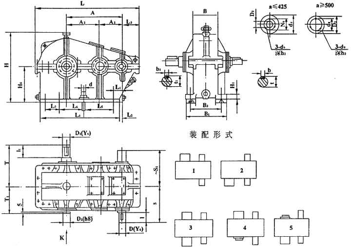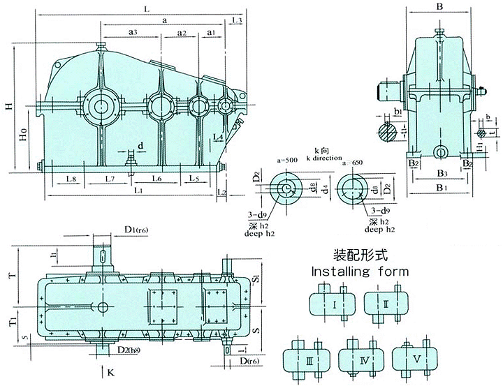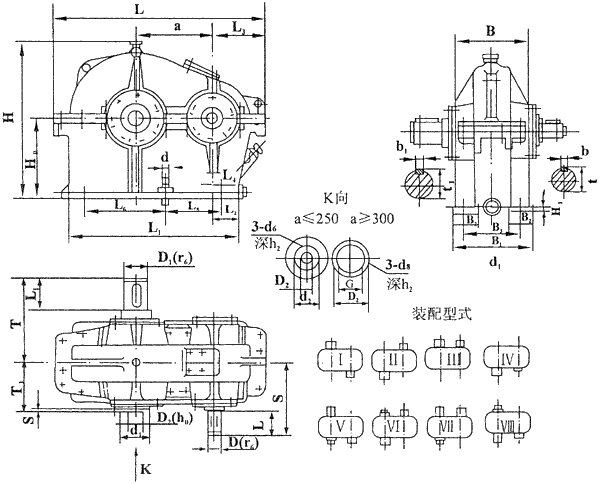 | 型 號 | 高速軸 | S | 低速軸 | T | 裝配形式 | 最大質量kg | |||||||||||